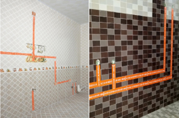 1、廚房、衛(wèi)生間大面積墻面磚鋪貼完,清理磚面,用公司統(tǒng)一水電標(biāo)示貼標(biāo)示水管線管走向。