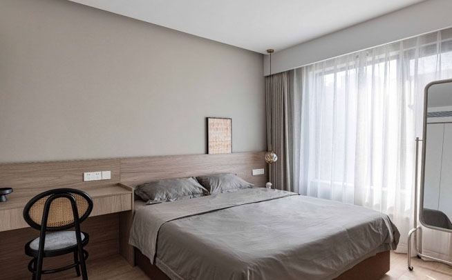 延續(xù)特調(diào)的淺咖至主臥,有趣的是,干凈統(tǒng)一的底色恰巧與小區(qū)的外墻形成了默契。橡木的紋路肌理透露著大自然留下的痕跡,與墻面和茶玻床頭氛圍燈相互呼應(yīng),產(chǎn)生奇妙的美學(xué)反應(yīng)。