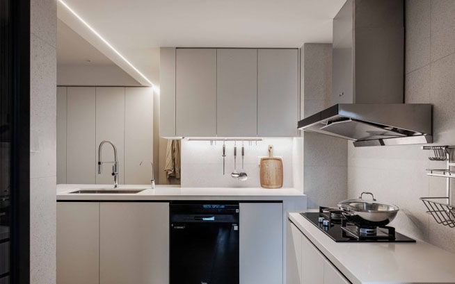 打通廚房與餐廳的隔斷,L型的廚房島臺(tái)從入戶處開始延伸。廚房沒有了遮擋物,視線自然通透。開放式的餐廚區(qū),一切以小舒顏的成長和安全出發(fā),無論孩子在何處,父母的視線都能緊隨其后。