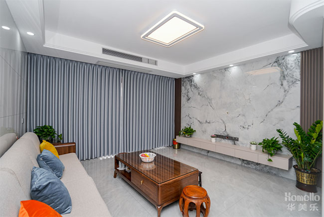 客廳主打淺色調(diào),放大空間的同時(shí)給整個(gè)空間通透明亮的基調(diào),沒(méi)有繁瑣的裝飾,符合簡(jiǎn)約設(shè)計(jì)理念。通鋪大理石地板讓室內(nèi)保持明亮且不易產(chǎn)生反光,與墻面的大理石瓷磚也做了色調(diào)上的呼應(yīng),讓整個(gè)空間的過(guò)渡感自然且舒適。電視背景墻由巖板大板磚砌成,兩旁做了柵欄木飾面,大氣且典雅。下方打造架空的抽屜柜作為電視柜,能給上下都留有空間,可以放綠植或者裝飾來(lái)增加的客廳的生機(jī)和顏值。