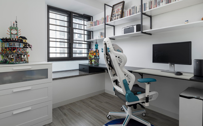 書房承載的不僅是兩人的辦公功能,更多的是興趣和愛好,書架為開放式吊架,上面一層碼得整整齊齊的是女主人的閑時讀物,房間還放著兩座樂高,都是小兩口的共同愛好。旁邊的儲物柜,透明磨砂的柜面讓大面積的白色得到了緩和。書桌利用窗臺墊高,減少了桌角的累贅,干凈利落,避免衛(wèi)生死角。