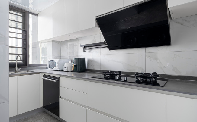 廚房以黑白色調為主,墻面用的是魚肚白墻磚,櫥柜吊柜和地柜均用的白色亞光烤漆,地板則延用與客廳一致的灰色大理石瓷磚?;疑珟r板的操作臺耐臟,在尺寸設計上沒有做下扣邊,讓巖板臺面更加精致地柜的設計上盡可能多的使用大件抽屜,使用更加方便。