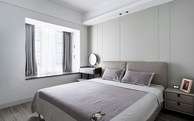 不同于客廳的沉穩(wěn),主臥的色調偏柔和,布簾顏色與床單相近,灰紫色的點綴令飽和度較低的臥室“回暖”,更溫馨柔和,木地板也比地板磚多了幾分暖意,更適合休息。硬包床頭背景墻與皮質床頭和床頭柜相襯,頂上是內嵌筒燈,實現(xiàn)局部照明。