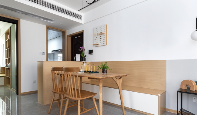 餐廳呢因為空間限制,選擇了卡座和原木桌椅結(jié)合的方式,卡座同時也是一排抽屜,可以存放一些坐墊、桌墊等物品,左側(cè)的鞋柜還可以充當隔段的作用,使其與大門隔開,有了空間的層次