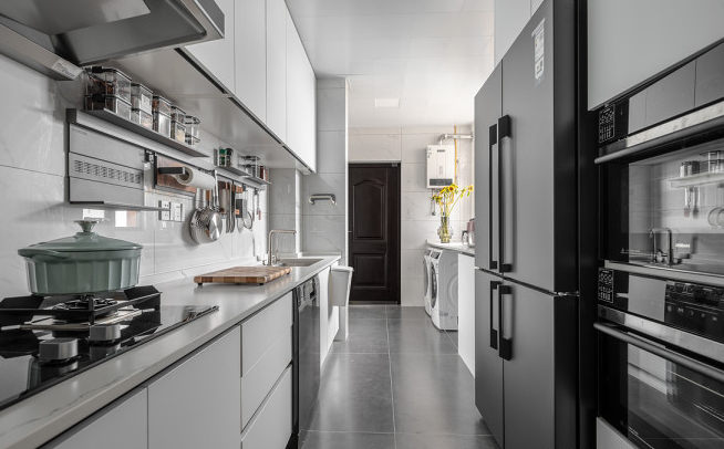 打通原始洗衣房與廚房隔墻,增加空間通透性。做兩側(cè)一字型柜體設(shè)計(jì),左側(cè)為廚房操作區(qū)域,右側(cè)為冷藏洗衣區(qū)。