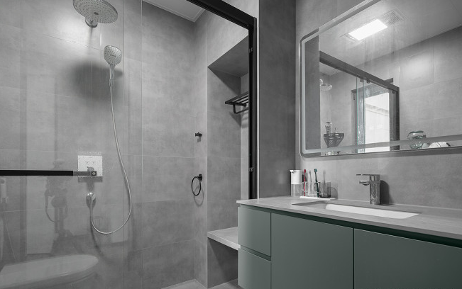 衛(wèi)生間選用灰色磚做墻地一體鋪貼,以增加空間延伸感。低飽和度綠色的浴室柜則讓空間更顯高級(jí)感。