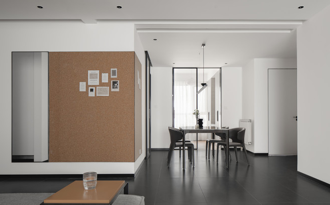 入戶(hù)左側(cè)墻體以穿衣鏡與軟木裝飾,延伸至餐廳區(qū)域,使空間在視覺(jué)上更具延續(xù)感,軟木材質(zhì)的溫潤(rùn)給予空間溫度的同時(shí),后期也可作為寶寶成長(zhǎng)記錄的溫馨一角。